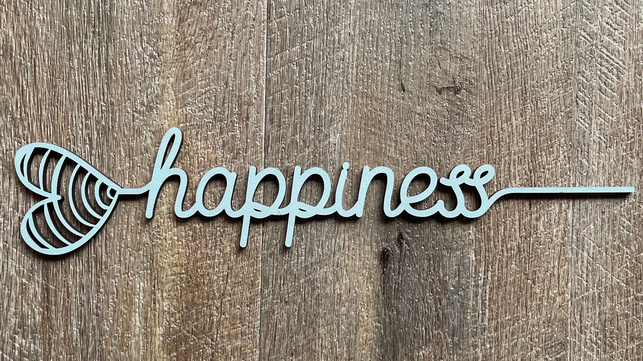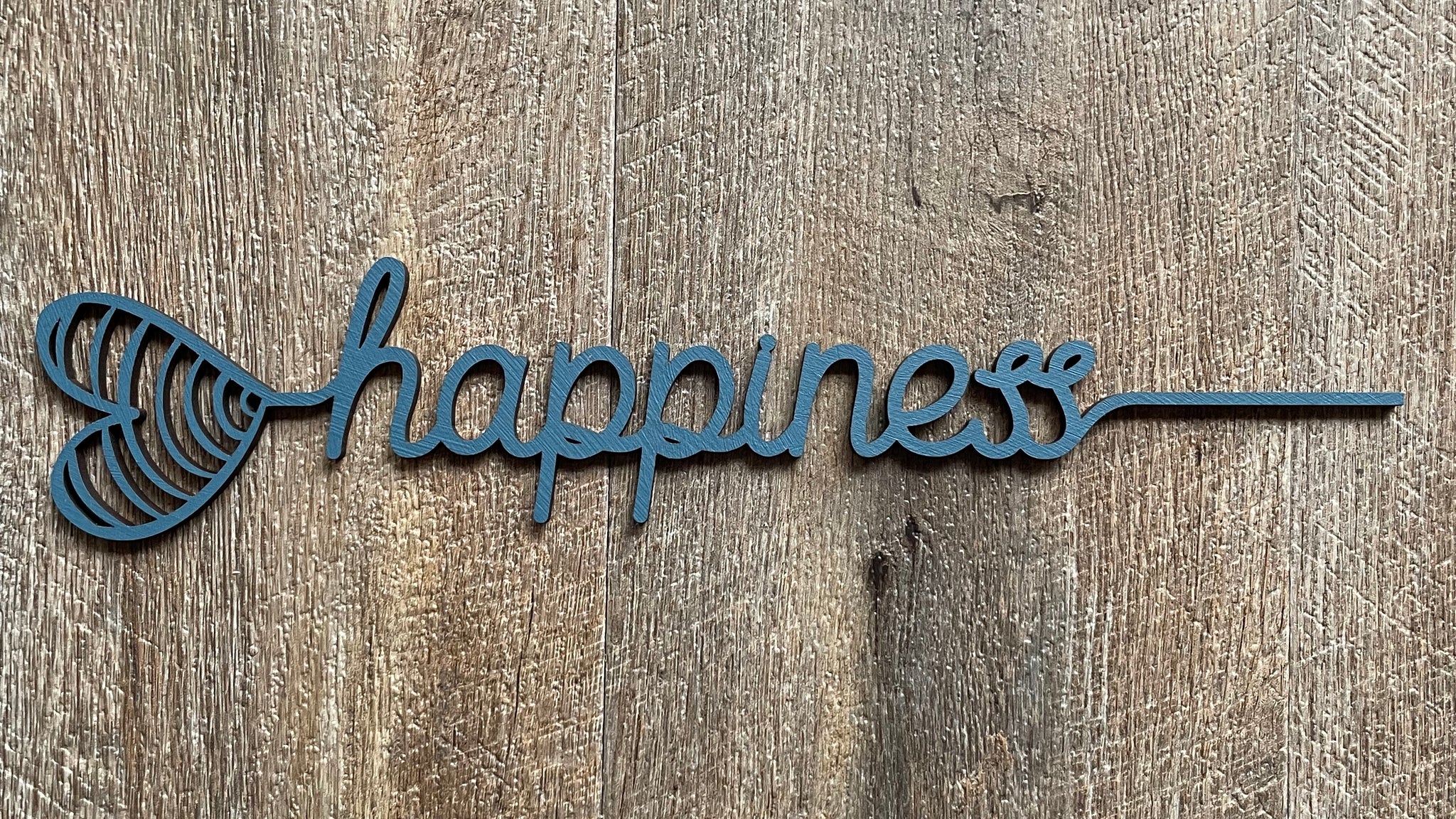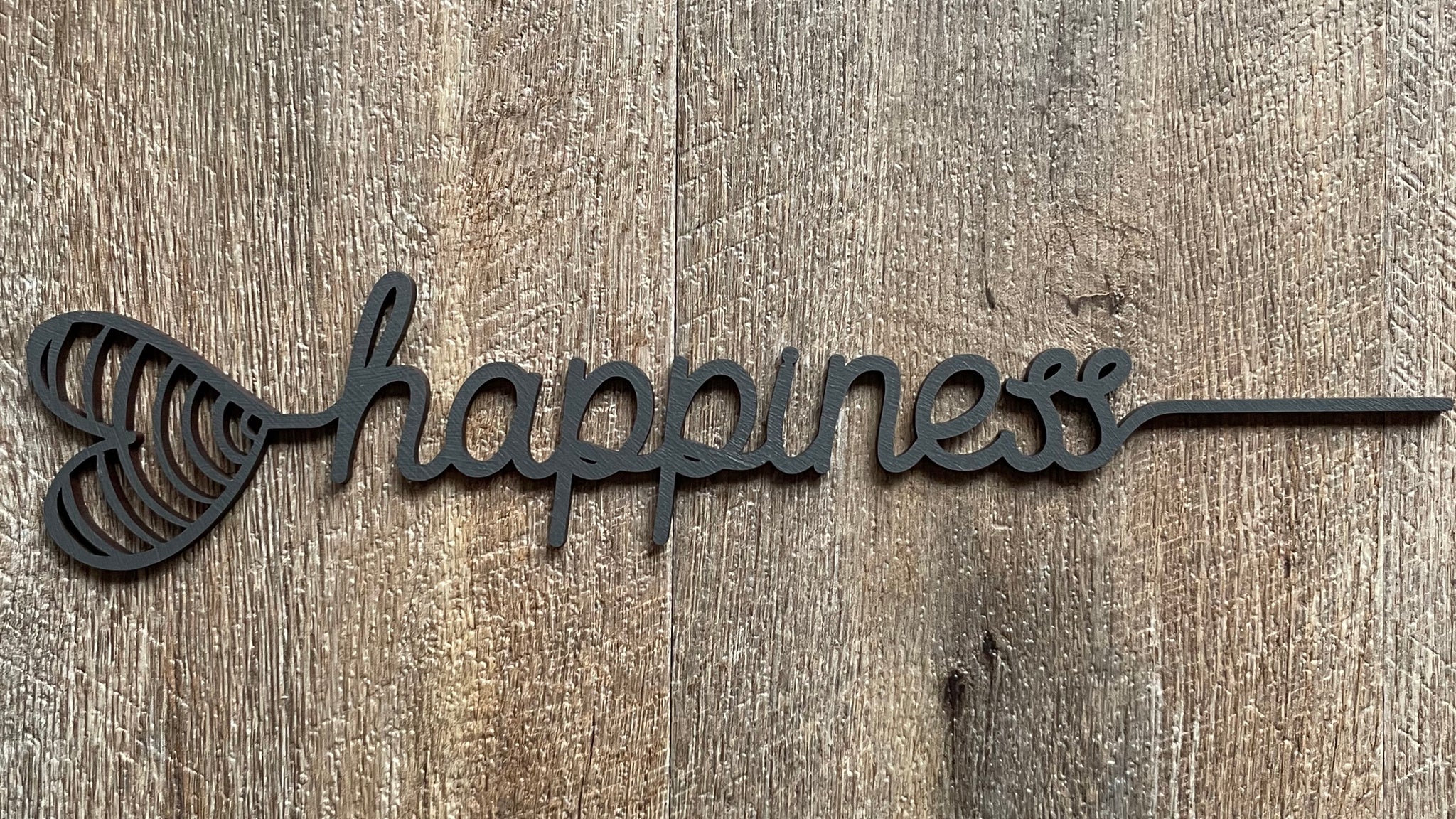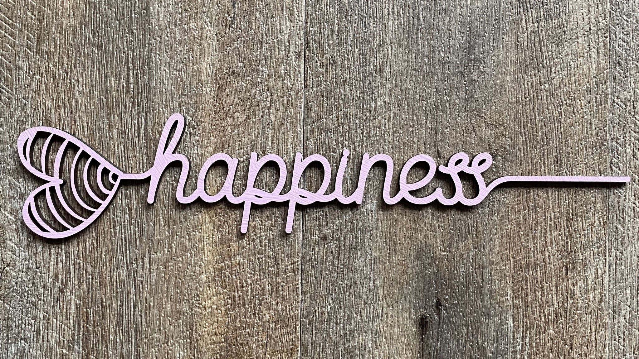 The word HAPPINESS is written in cursive ending in a shapely heart, all on a stick.