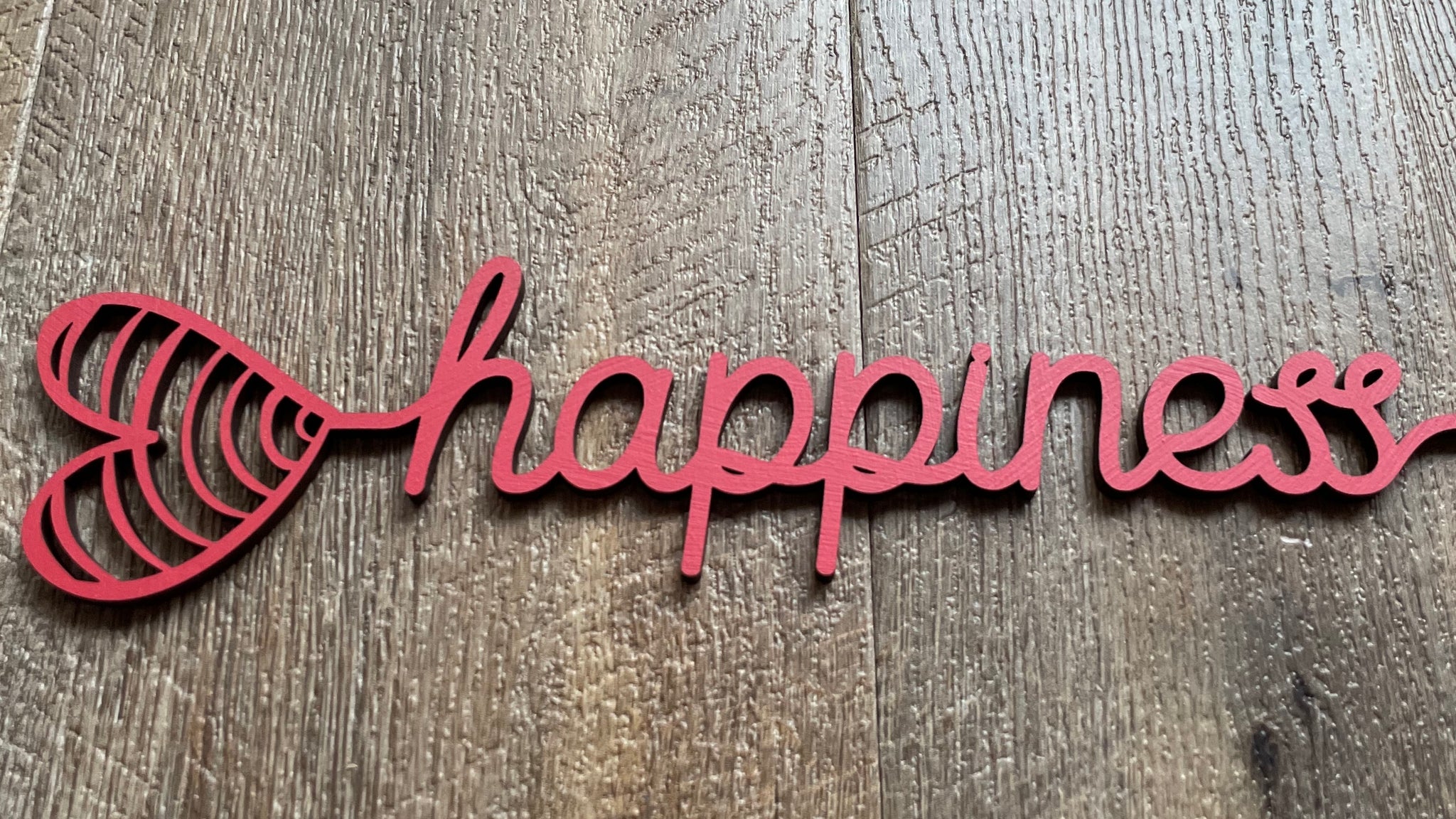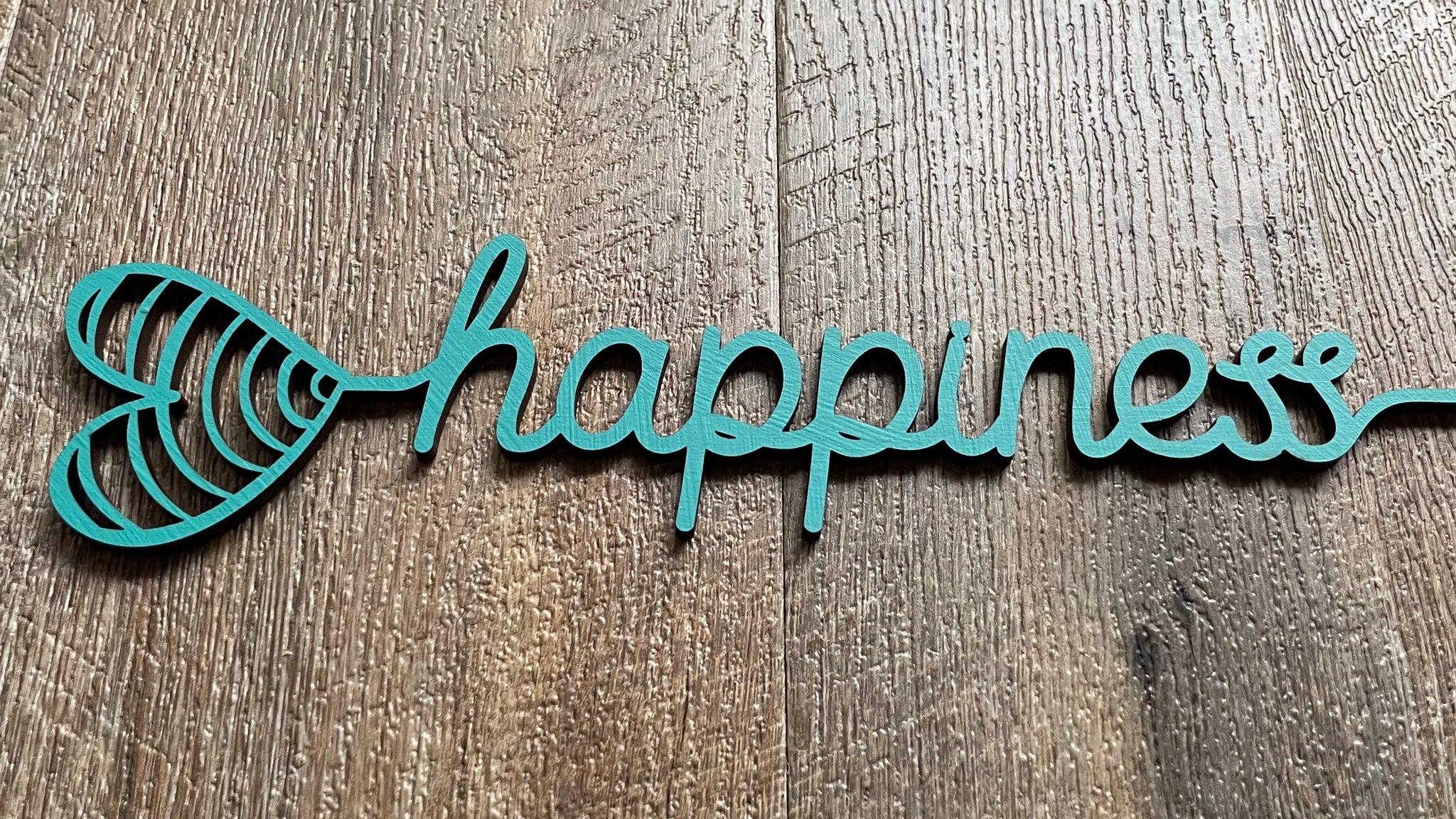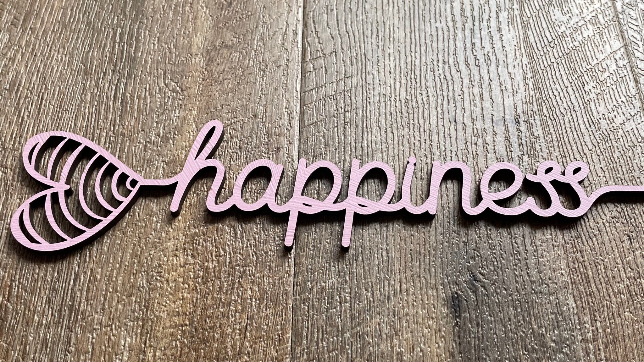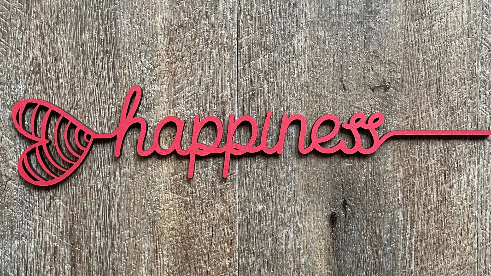 The word HAPPINESS is written in cursive ending in a shapely heart, all on a stick.