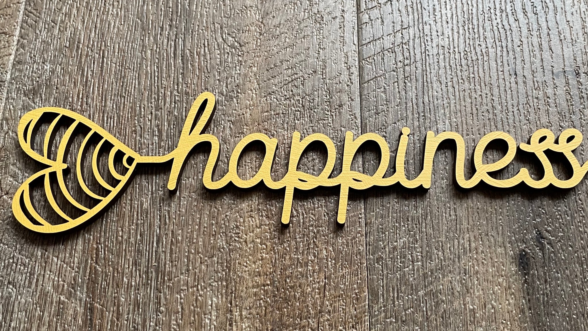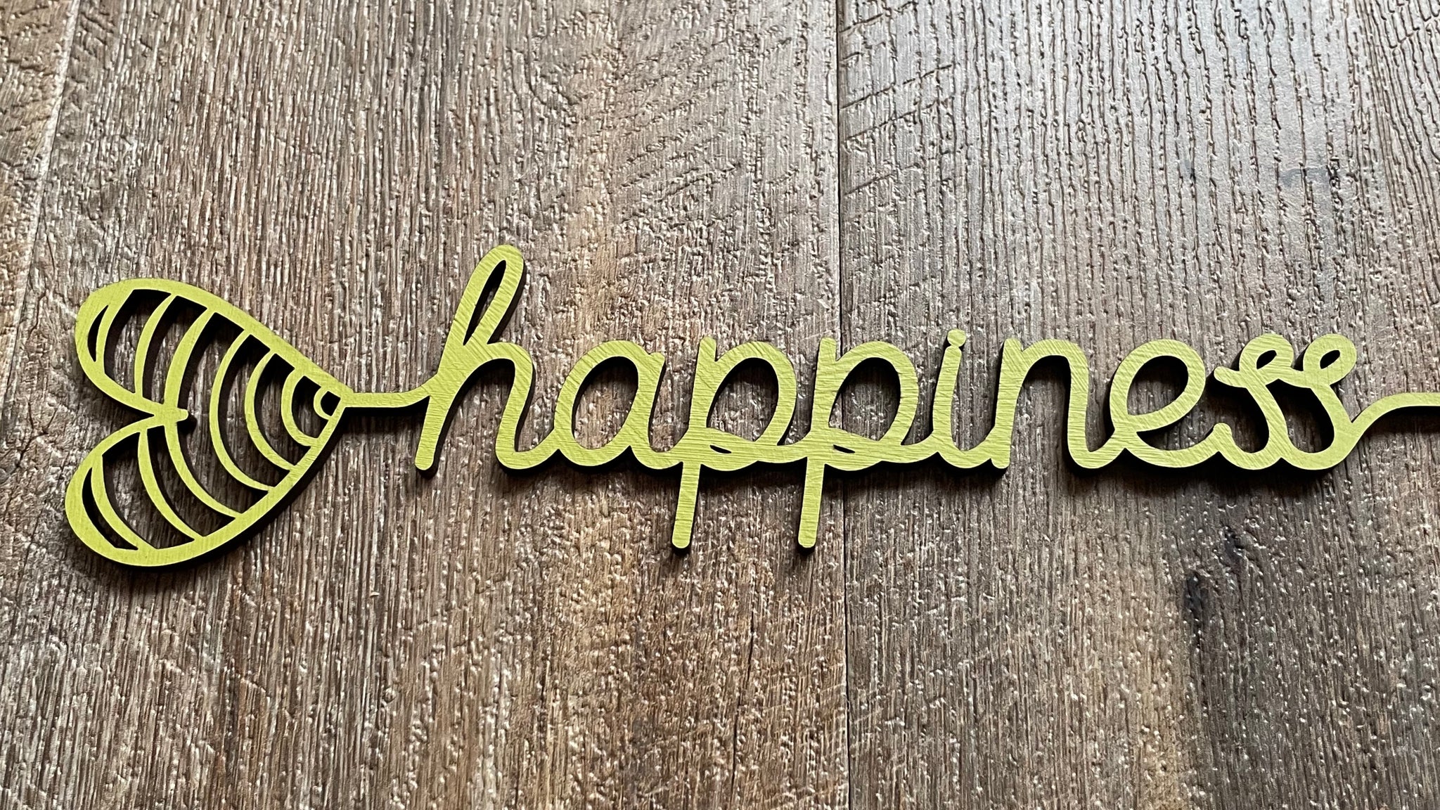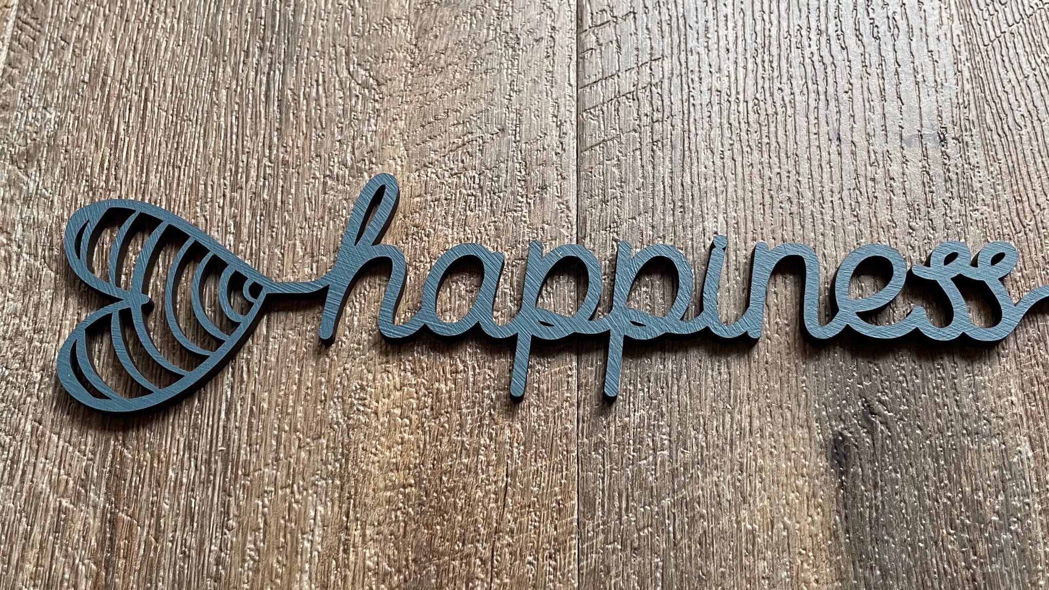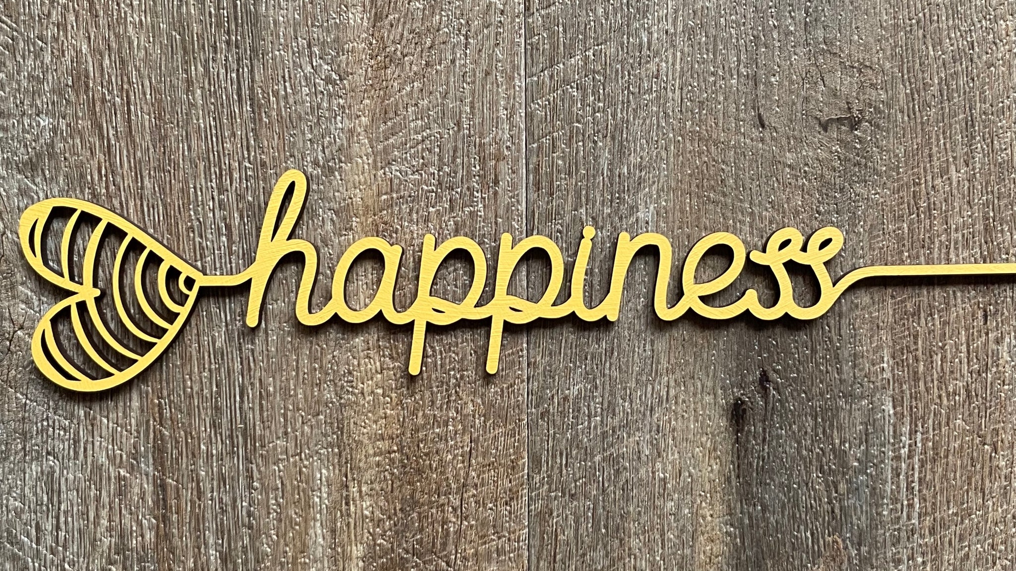 The word HAPPINESS is written in cursive ending in a shapely heart, all on a stick.