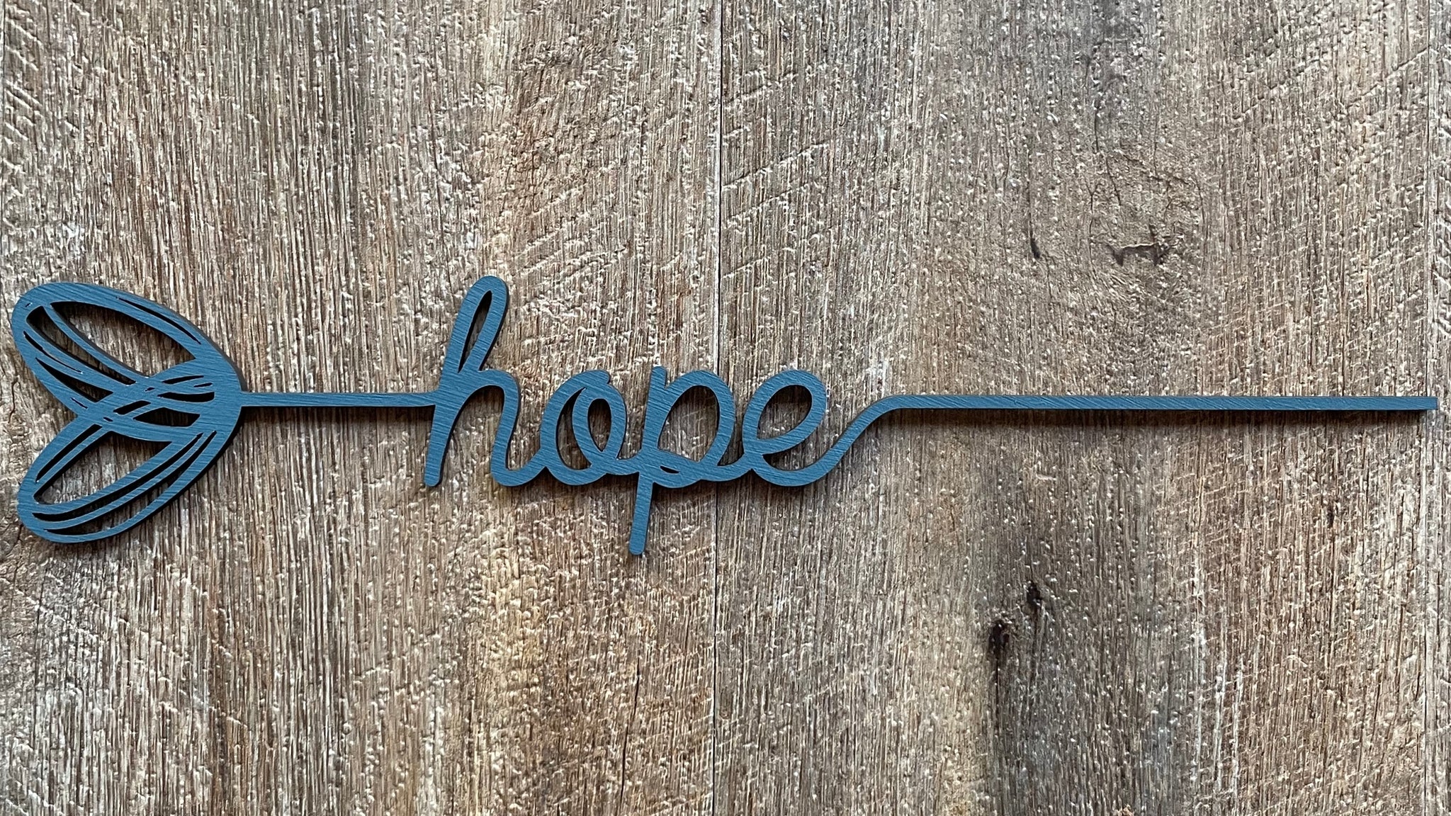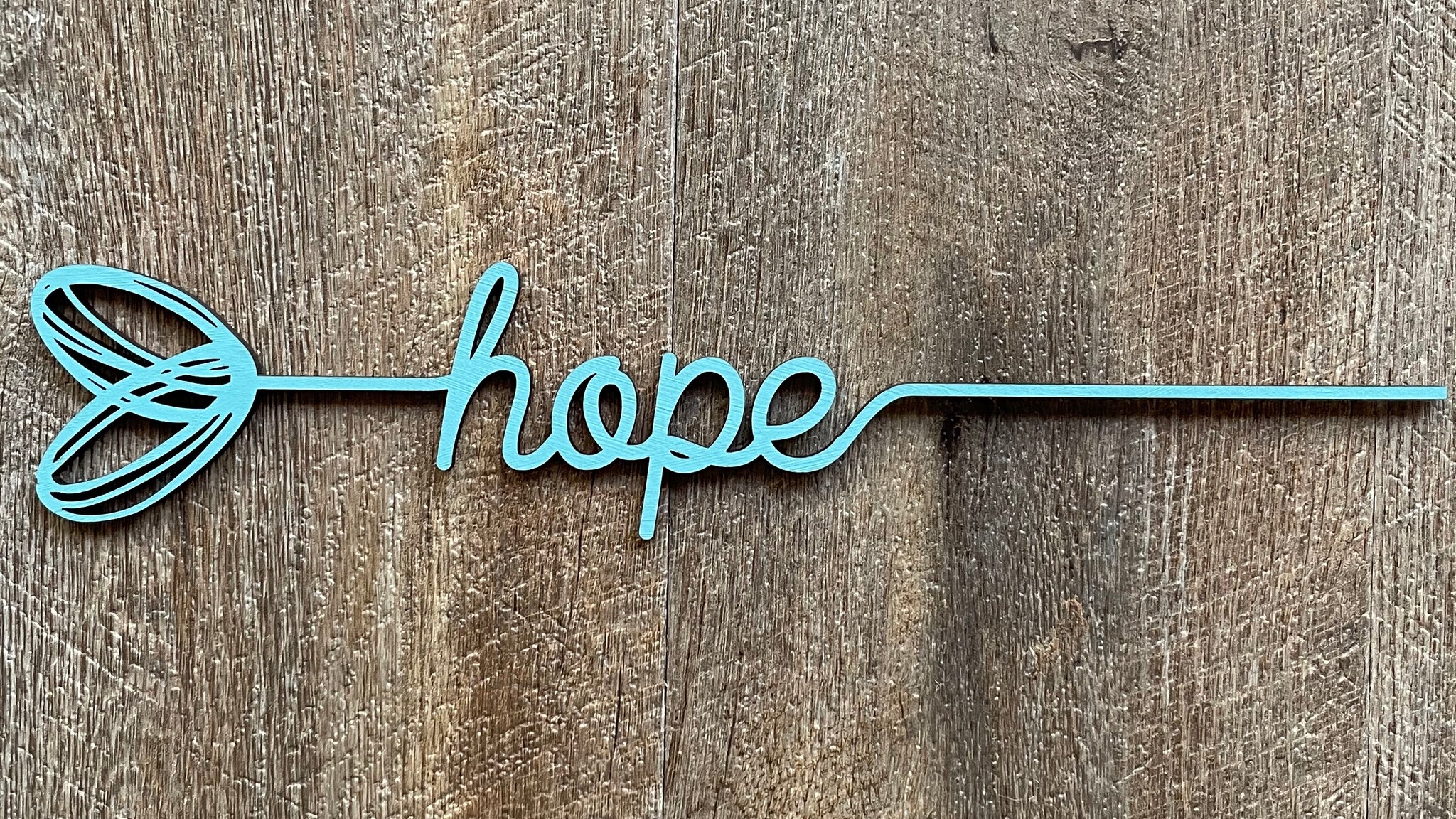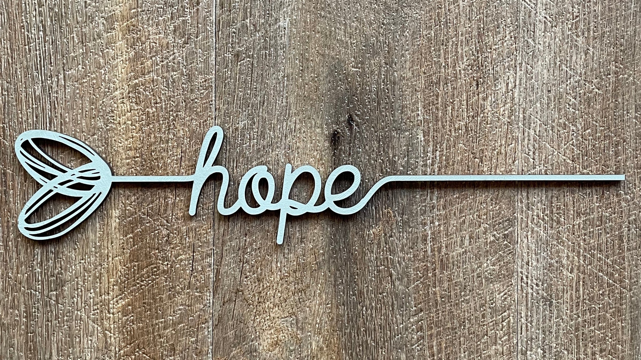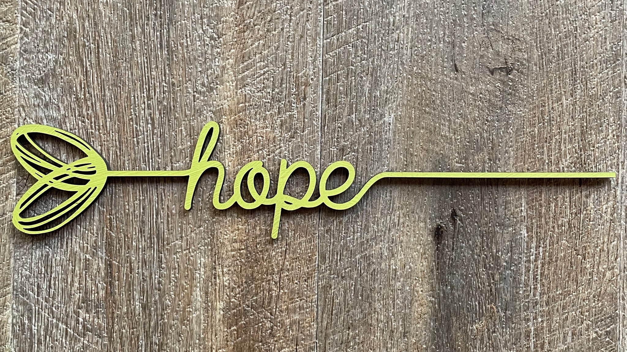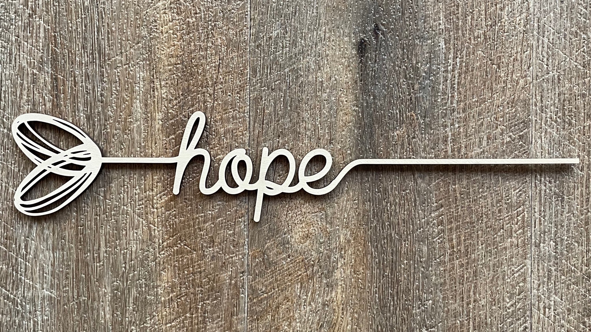 The word HOPE is written in cursive ending in a shapely heart, all on a stick.