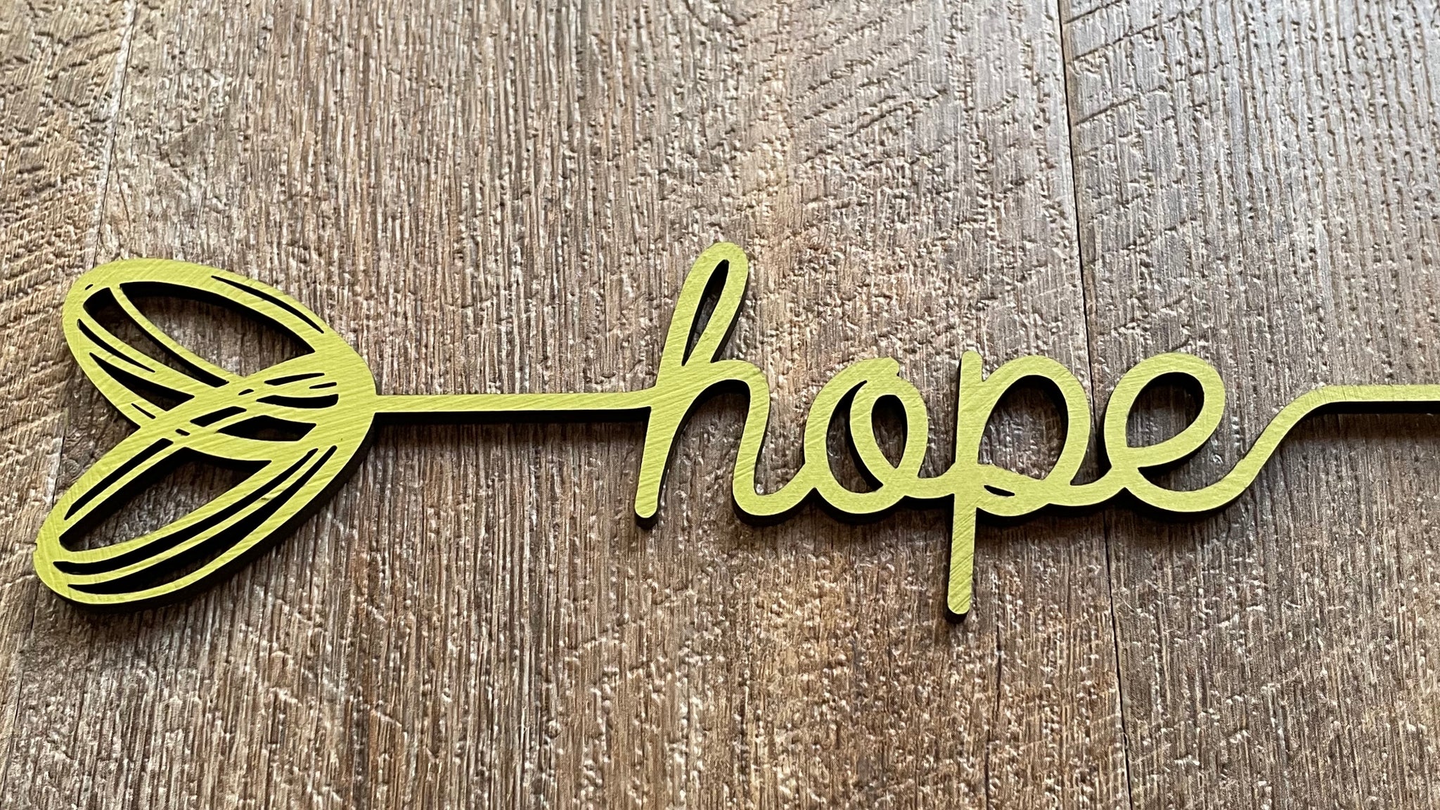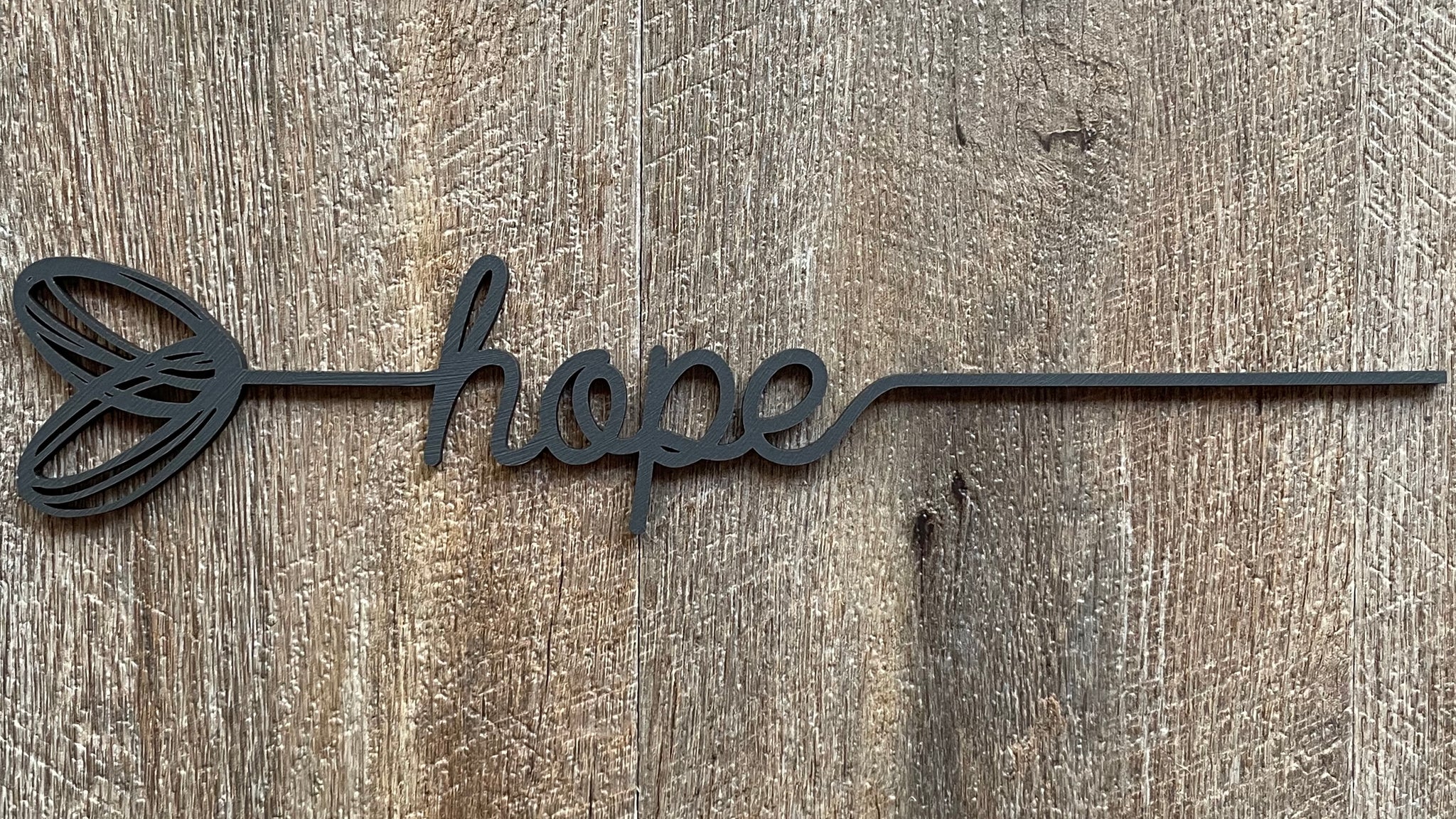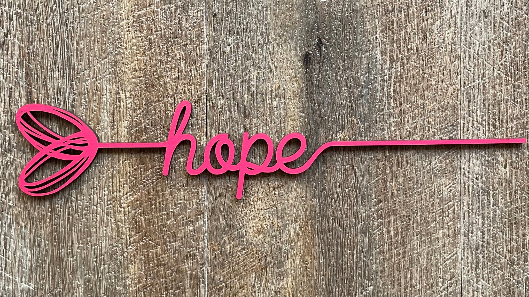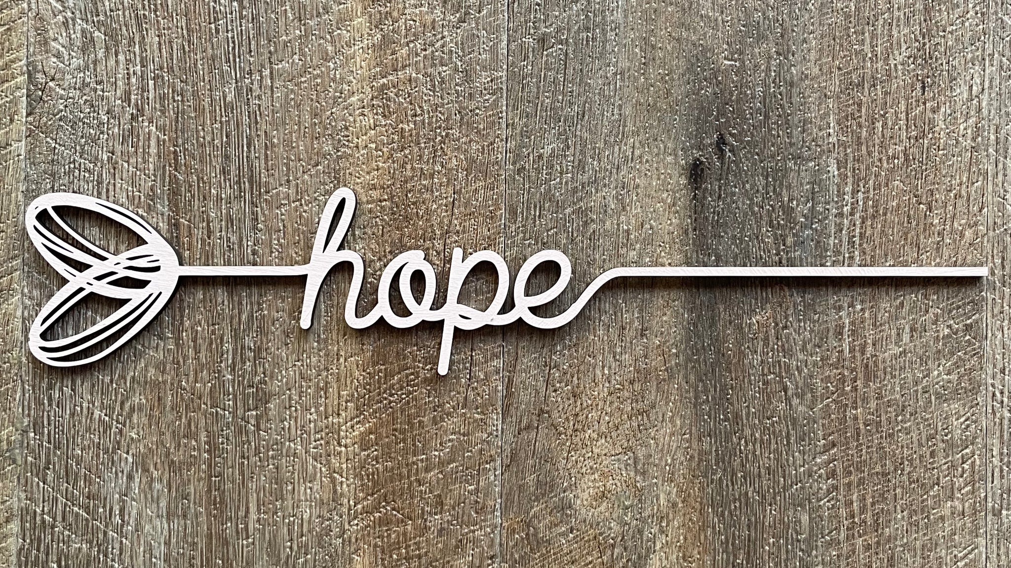 The word HOPE is written in cursive ending in a shapely heart, all on a stick.