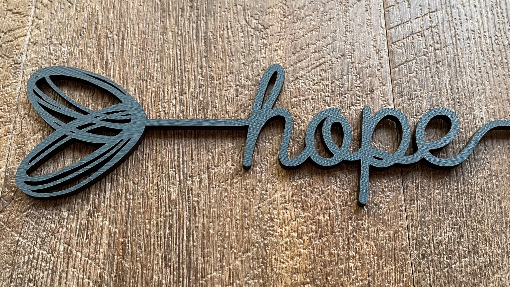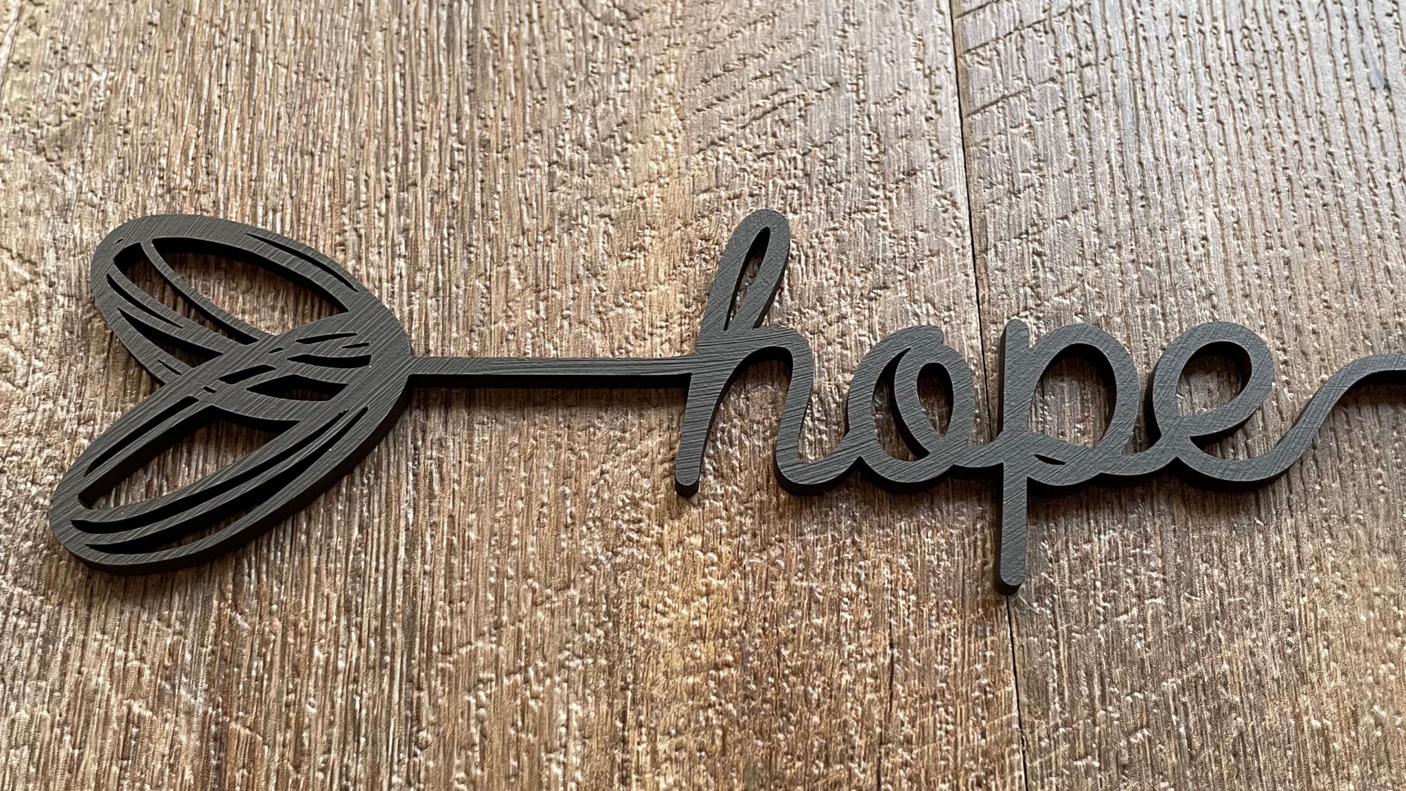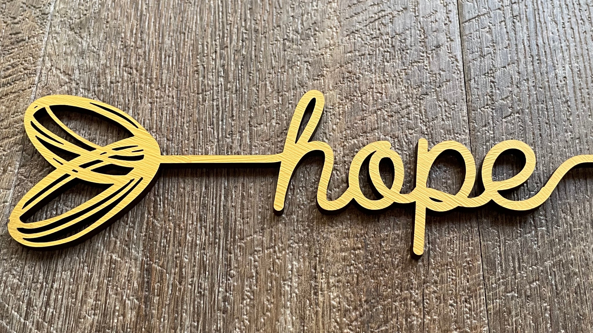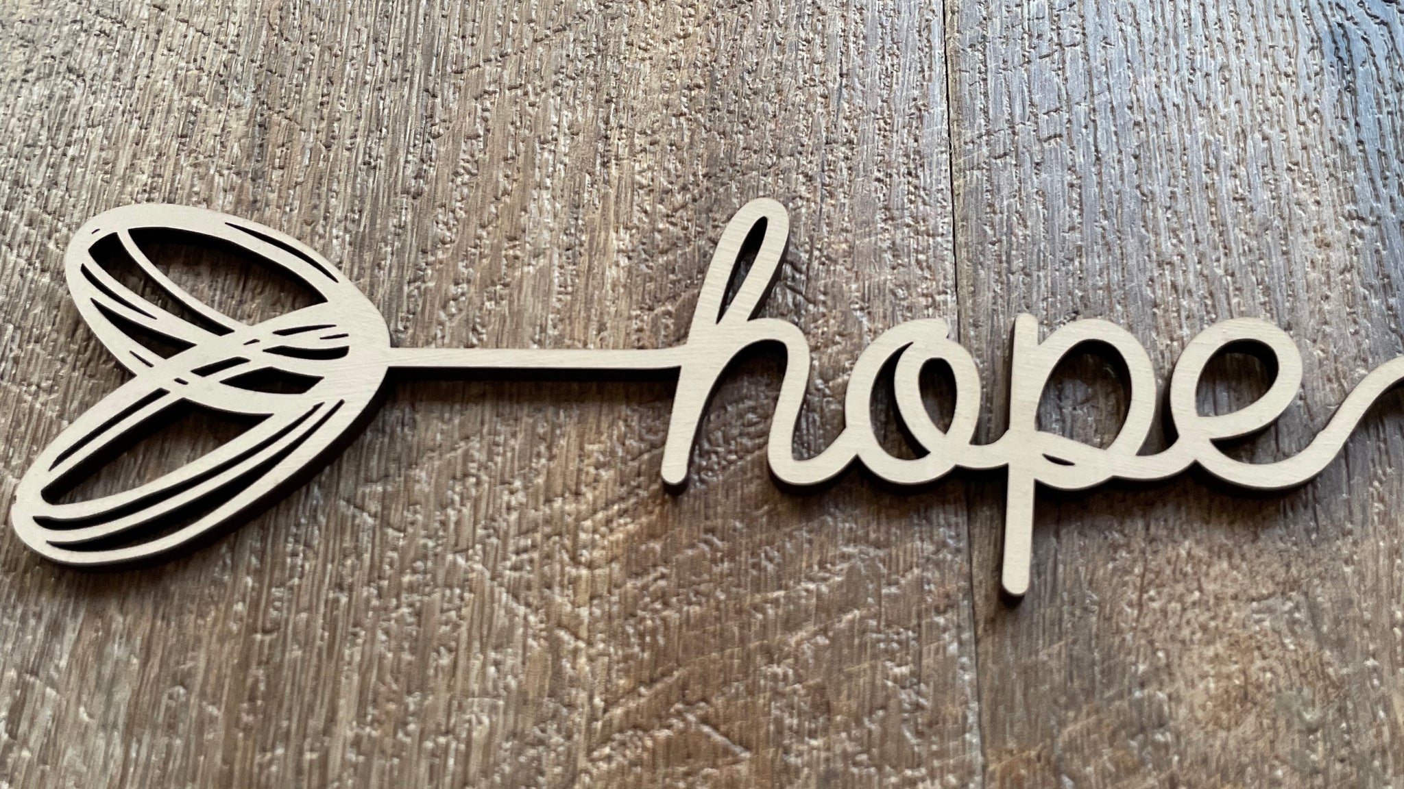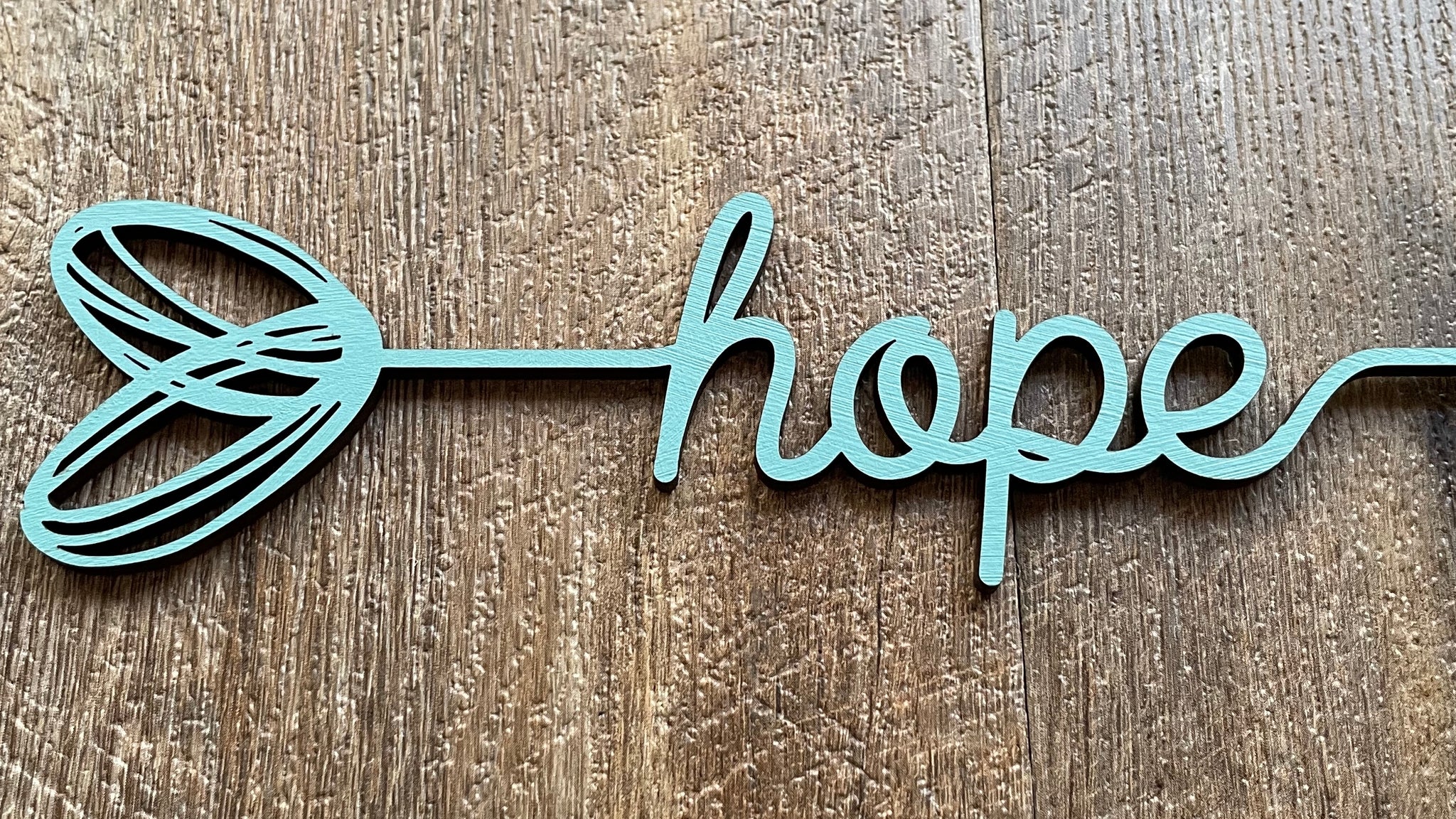 The word HOPE is written in cursive ending in a shapely heart, all on a stick.