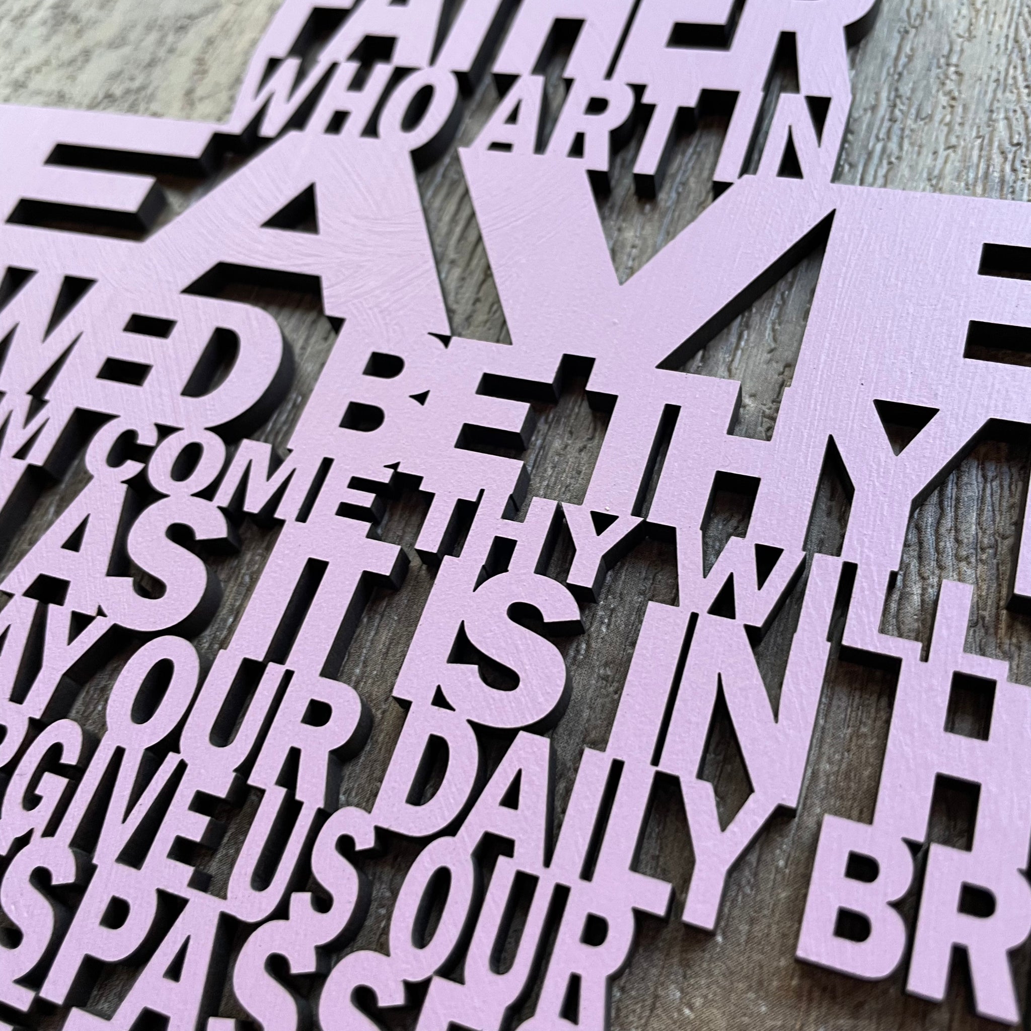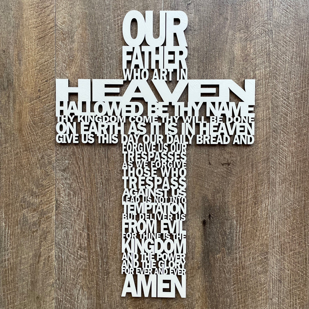 The Lords Prayer in the shape of a cross, intricately cut in the finest detail.  Painted with luxurious Annie Sloan Chalk paint creating a beautifully textured piece of art ready for display.  The "Our Father" sign is made from 4mm MDF and is available in a variety of colours.