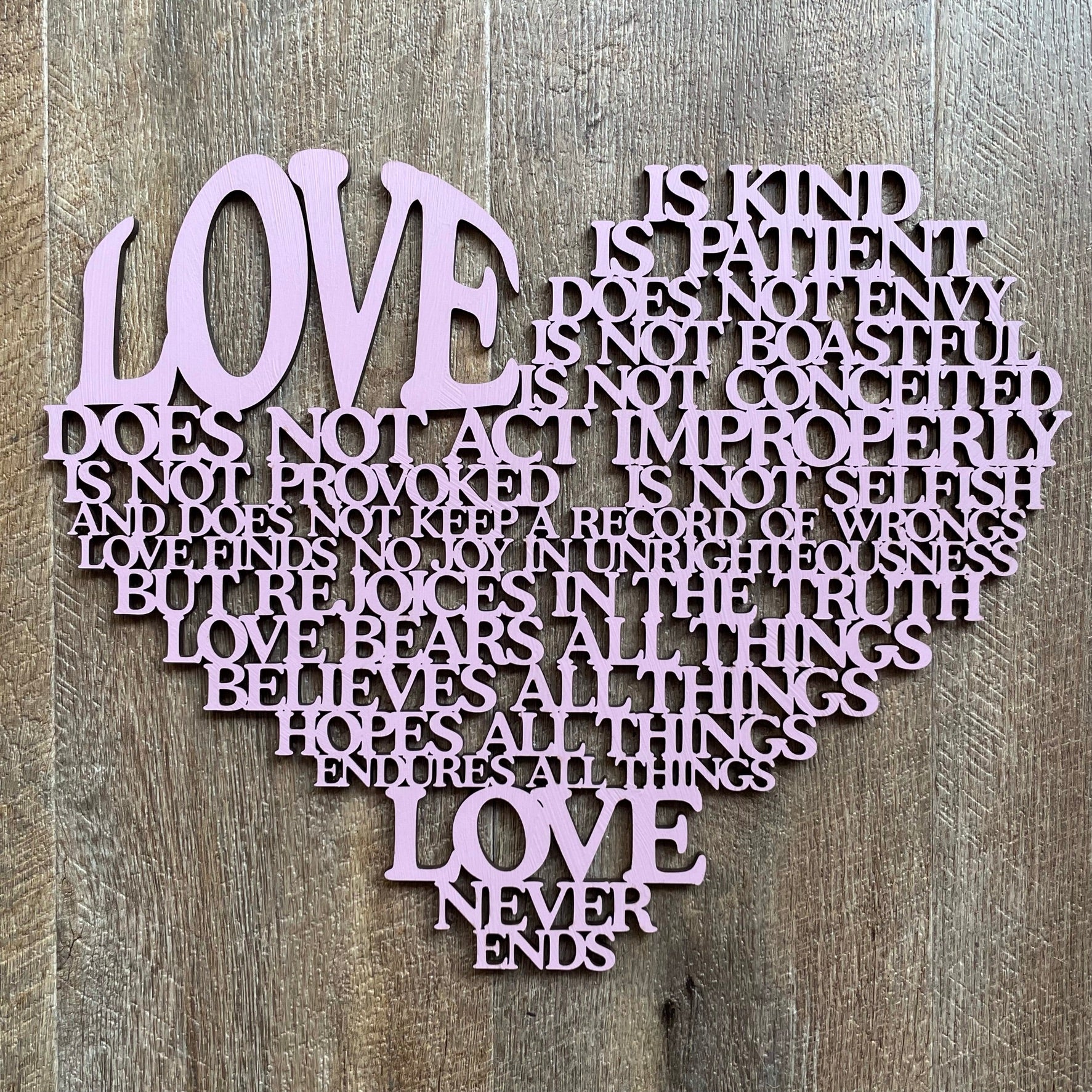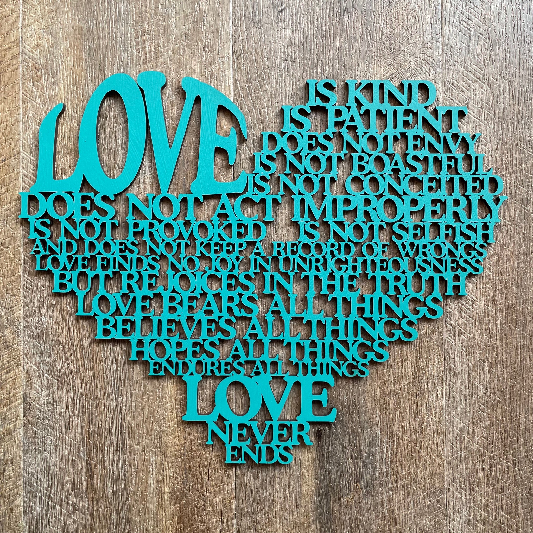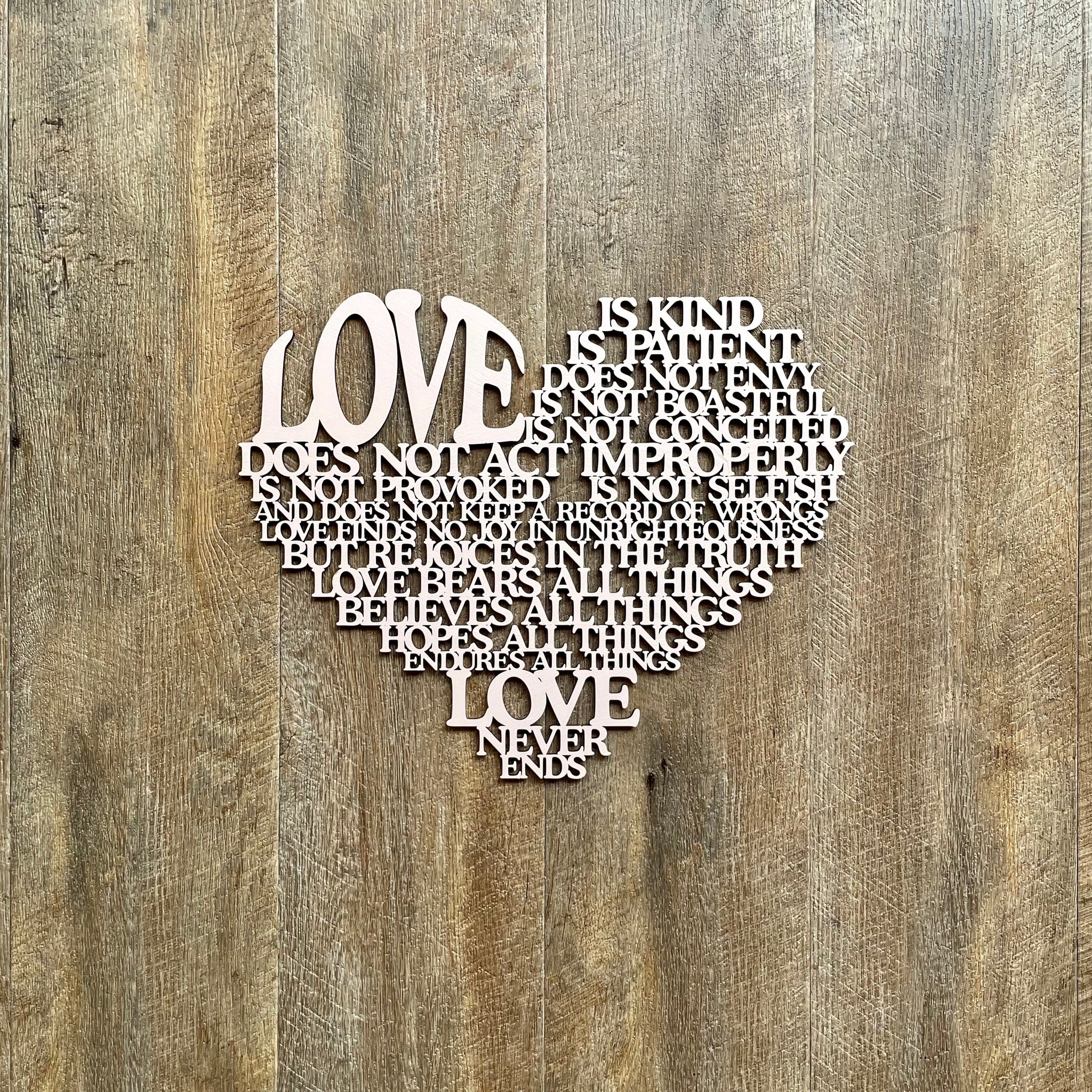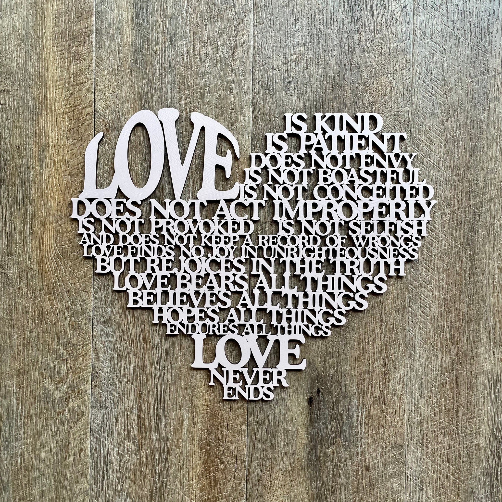 • Our laser cut  "Love is..." sign is a heart shaped poem depicting the words of Corinthians 13, the Love poem...often used in wedding vows.