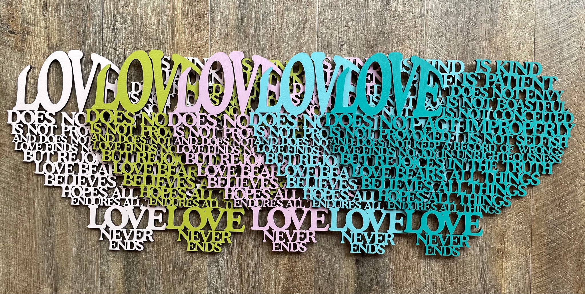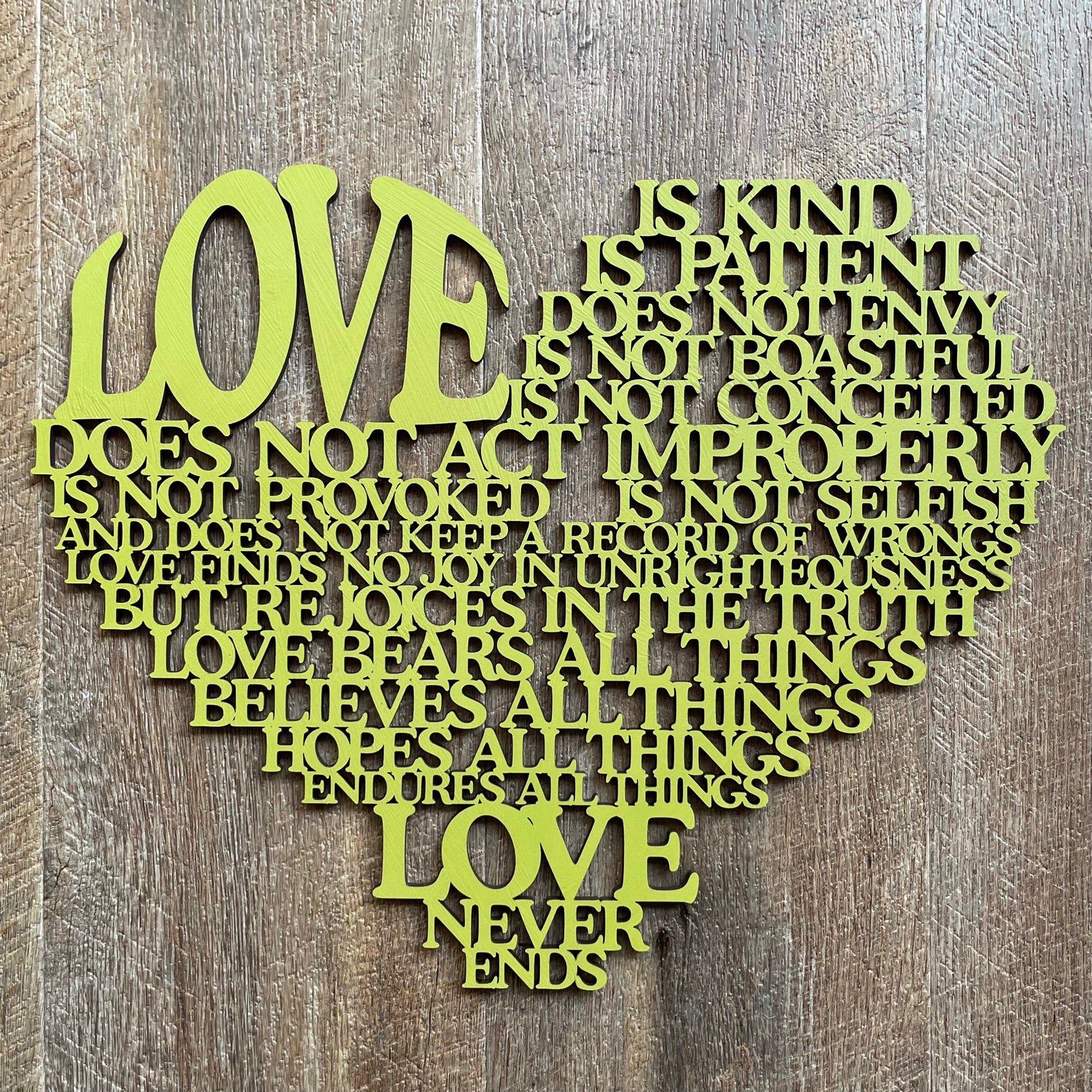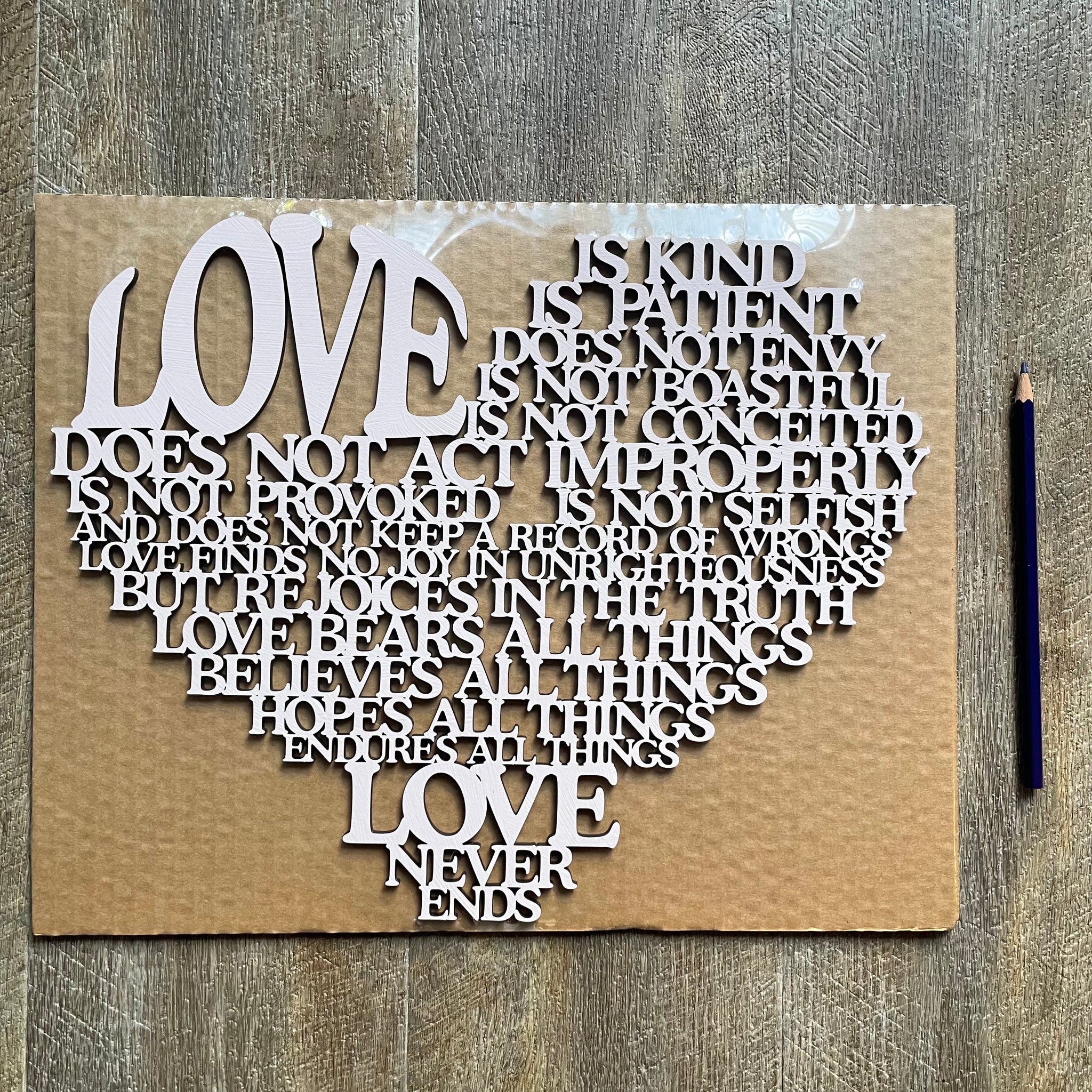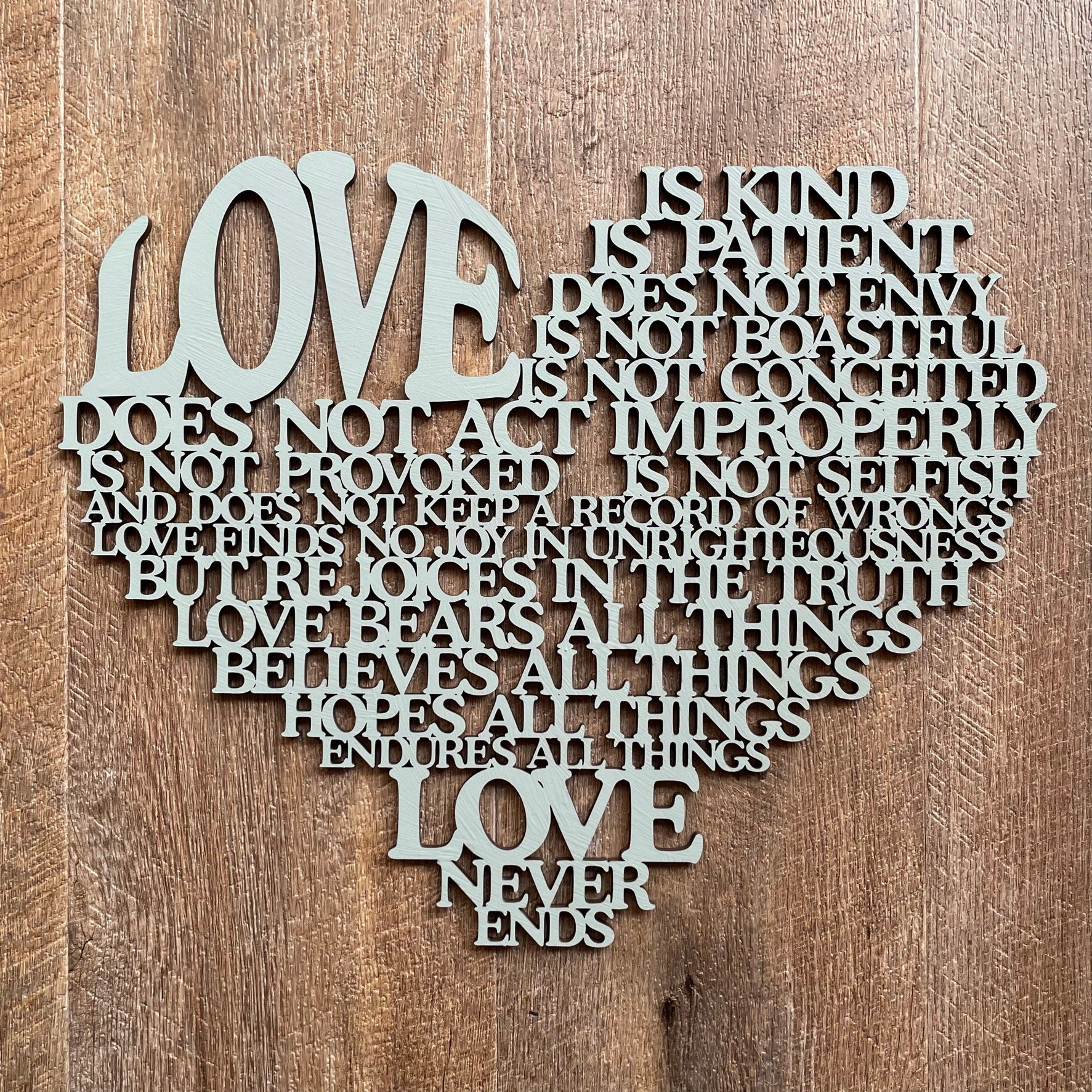 • Our laser cut  "Love is..." sign is a heart shaped poem depicting the words of Corinthians 13, the Love poem...often used in wedding vows.