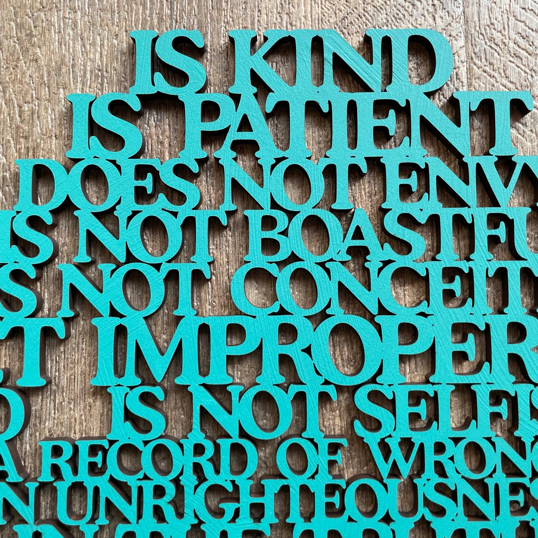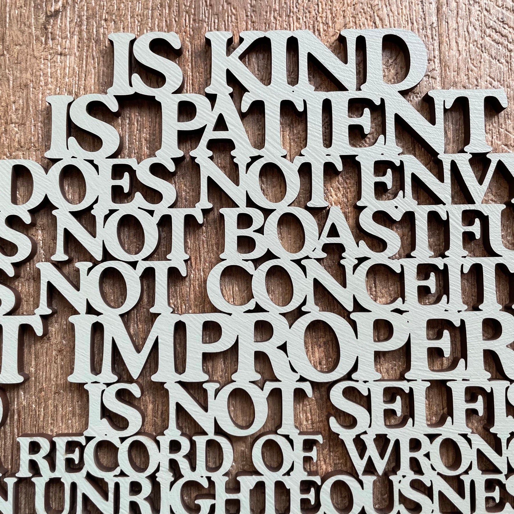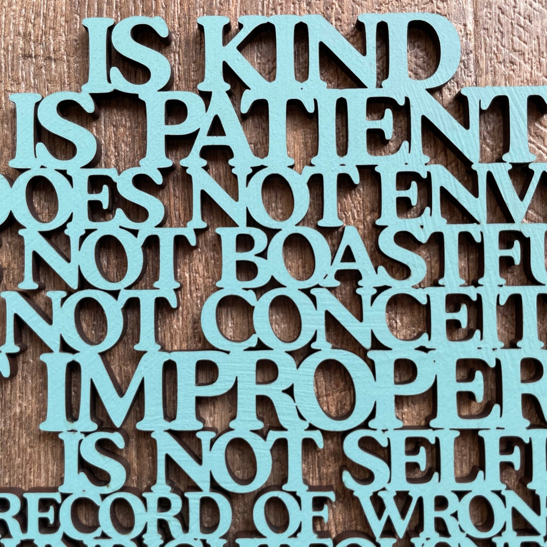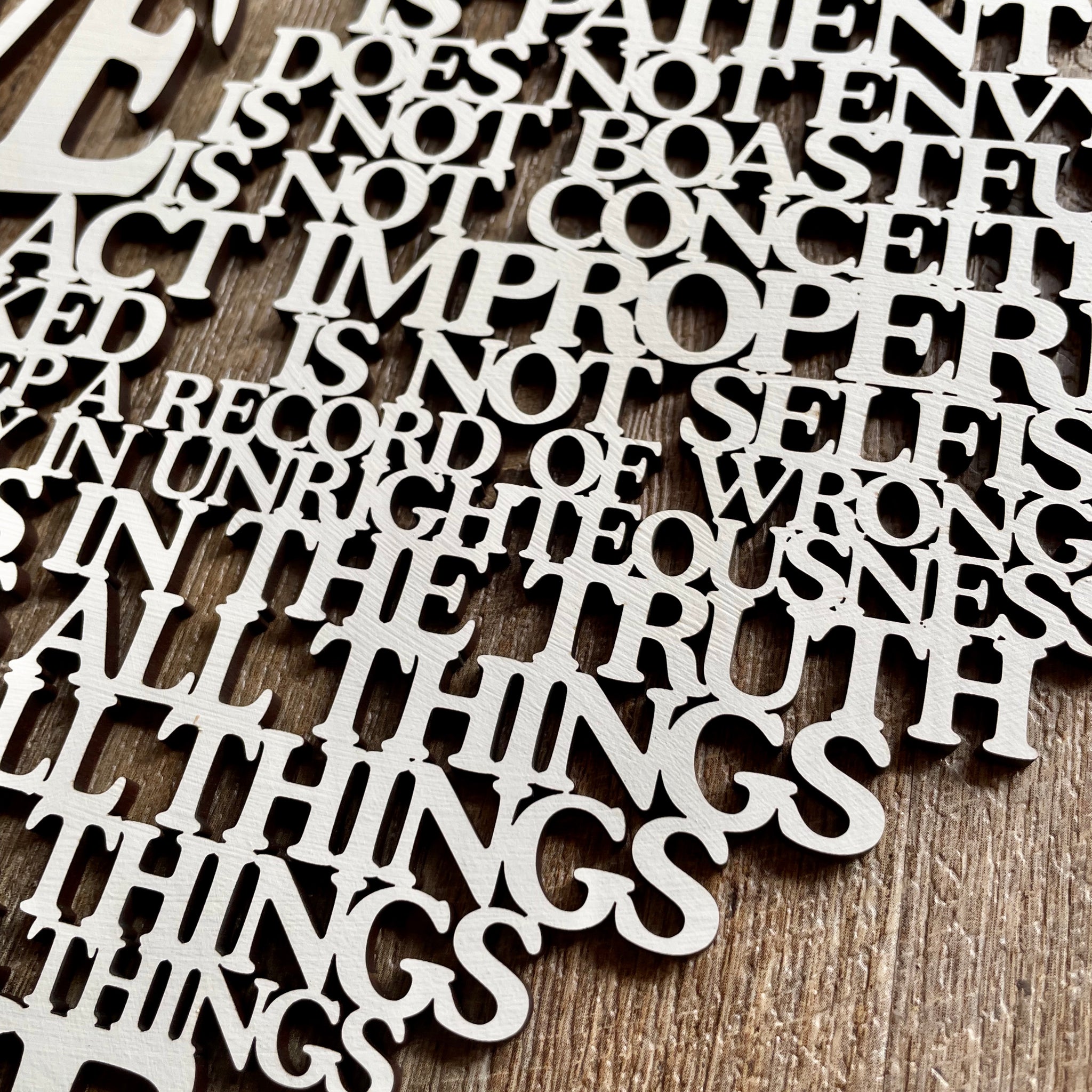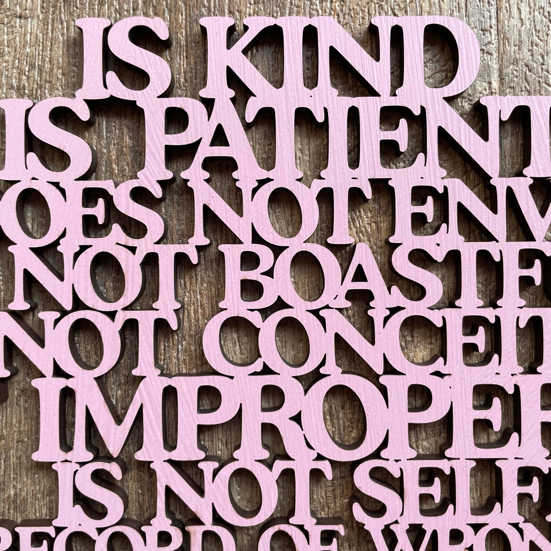 • Our laser cut  "Love is..." sign is a heart shaped poem depicting the words of Corinthians 13, the Love poem...often used in wedding vows.