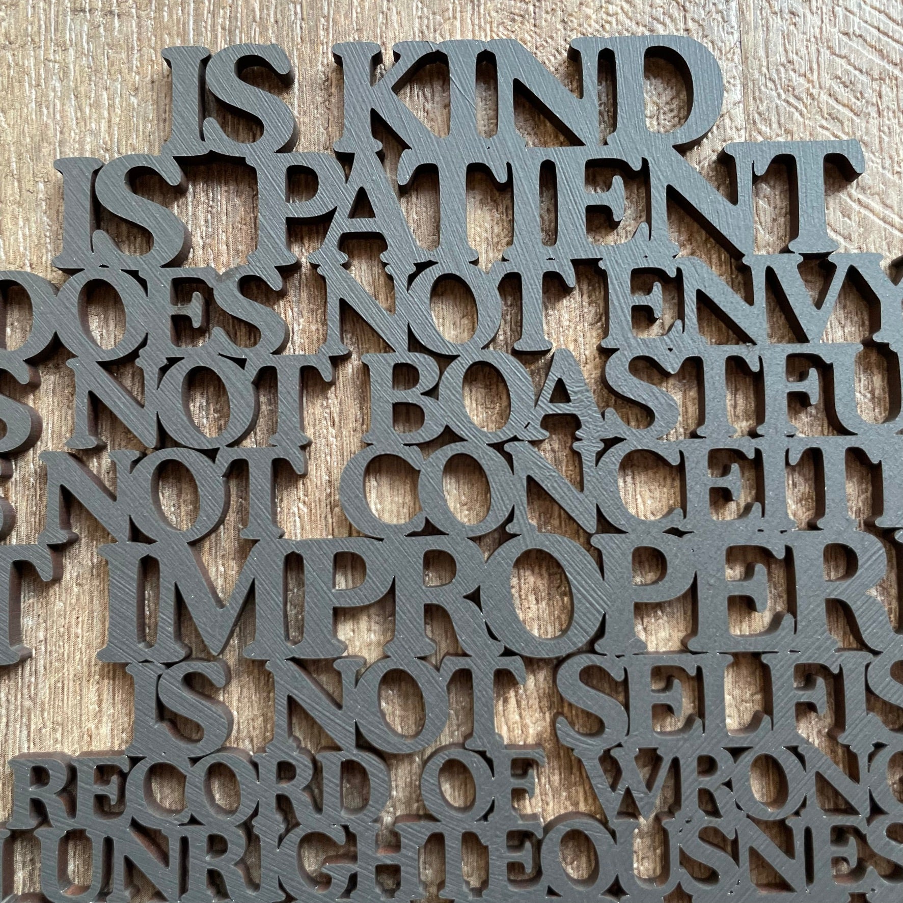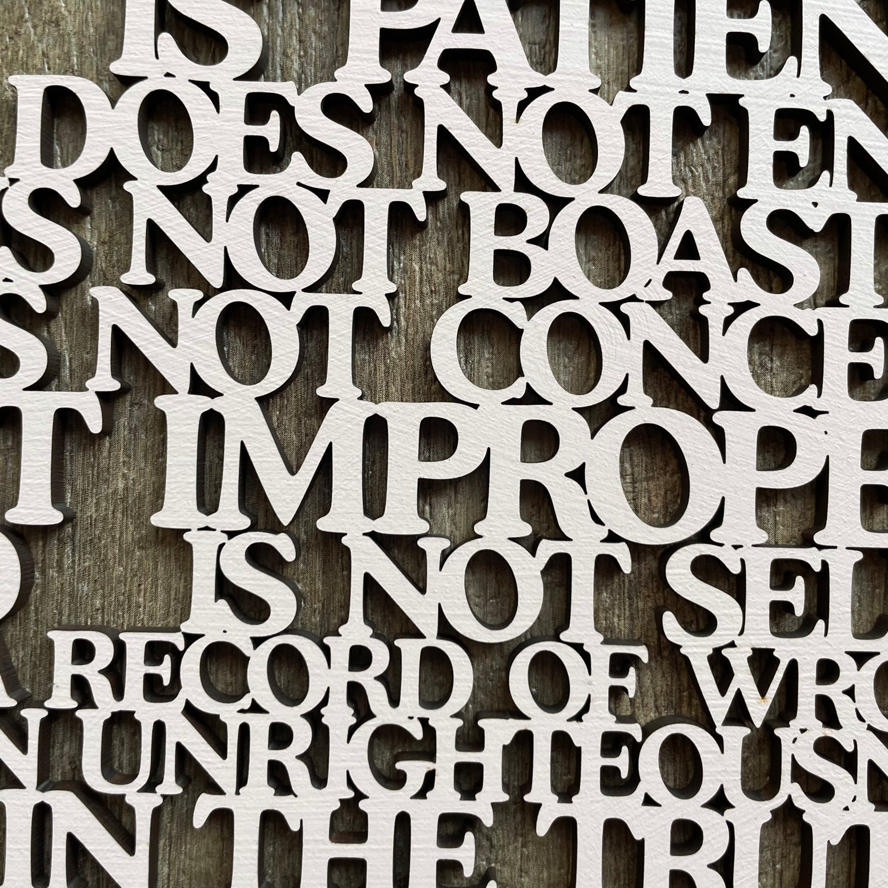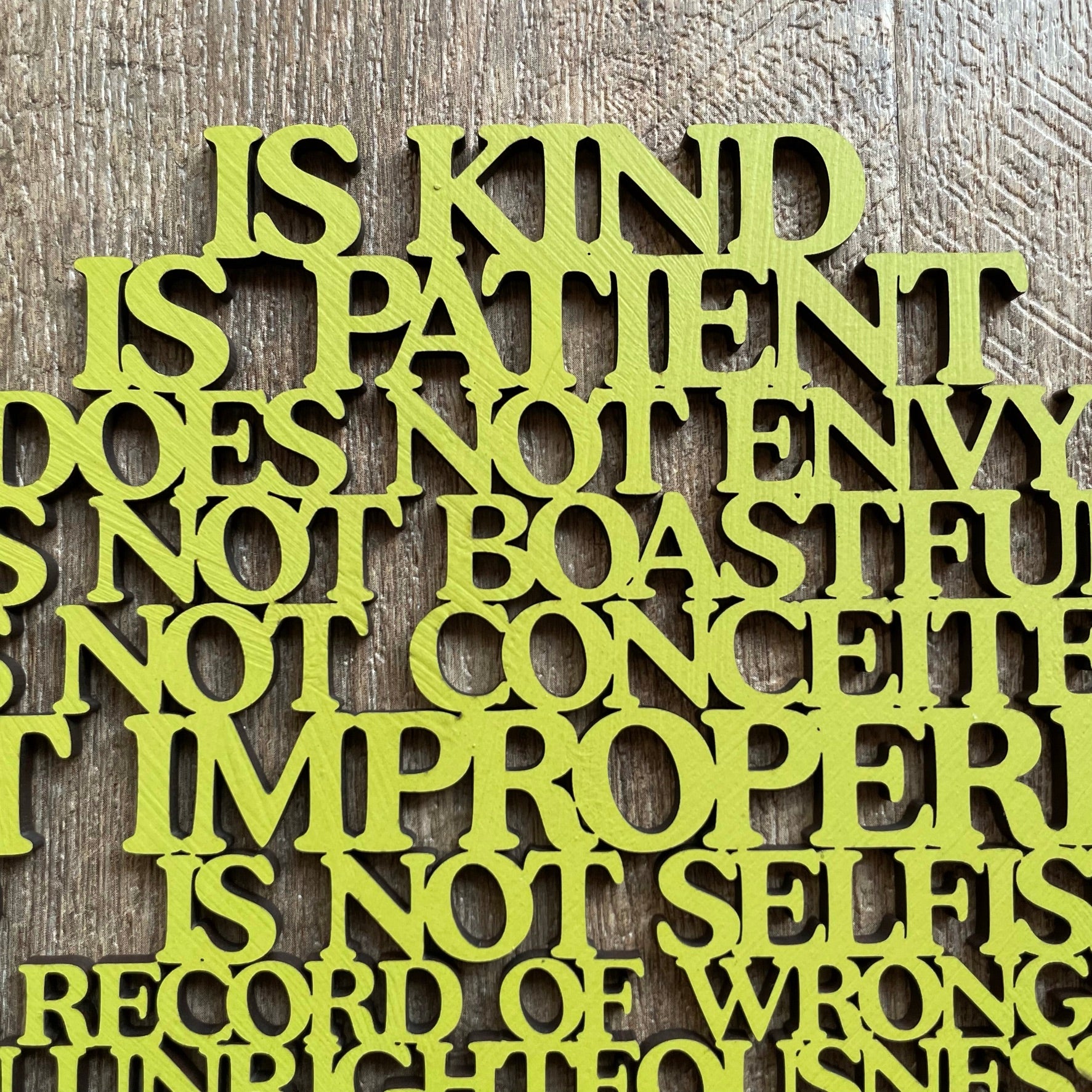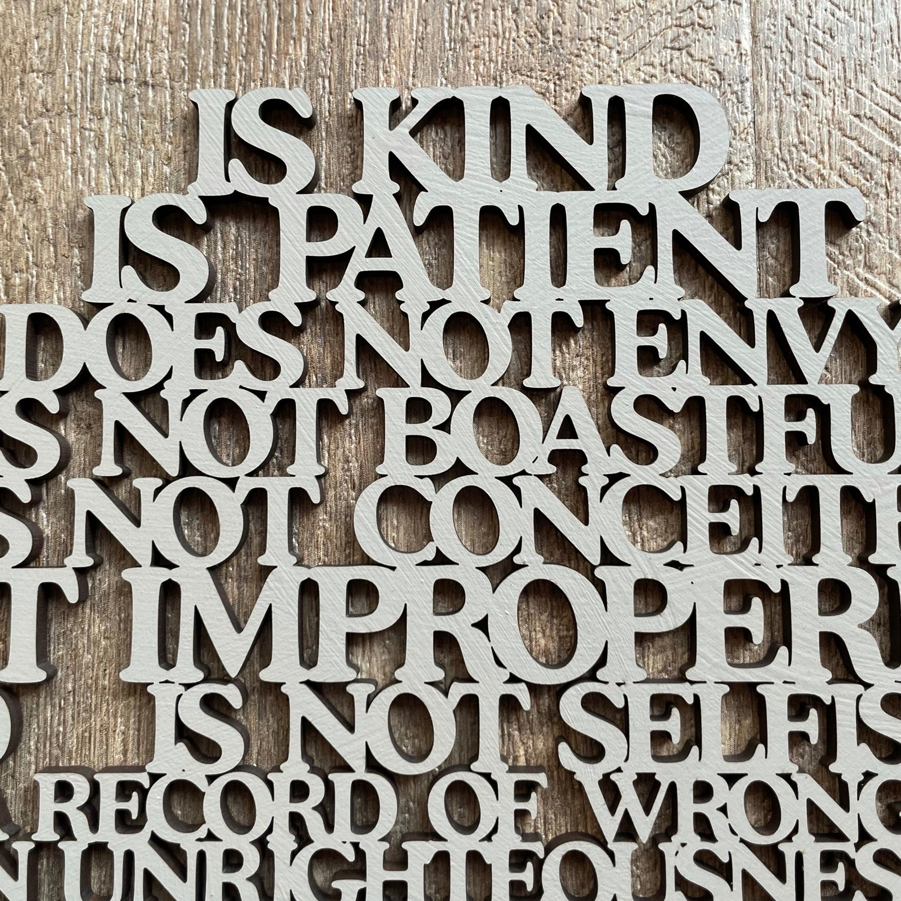 • Our laser cut  "Love is..." sign is a heart shaped poem depicting the words of Corinthians 13, the Love poem...often used in wedding vows.